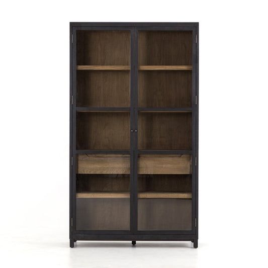 Two-tone transparency. Black drifted oak frames lighter interior shelving for subtle but striking contrast. Glass doors allow for prized possessions to dazzle on full display while a spacious interior drawer adds an out-of-view storage option.